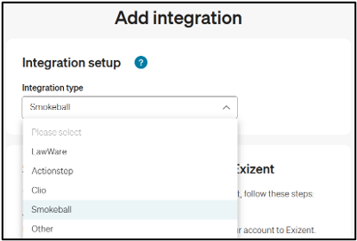 - Select Smokeball in the Integration type dropdown