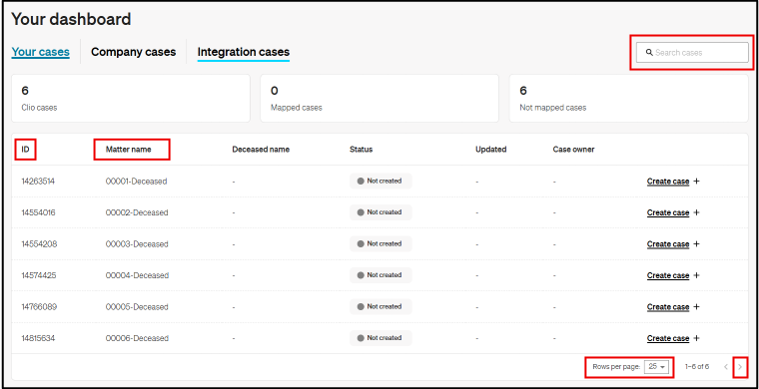 🔍You are able to expand the number of cases showing on a page by selecting a different option from the Rows per page drop down menu