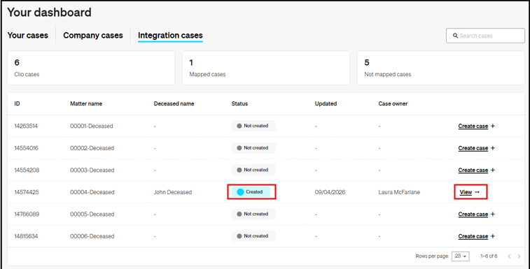 - Within the Integrations dashboard any matters that have already been transferred from Clio will show as Created and can also be accessed here by selecting View