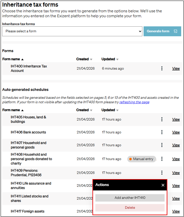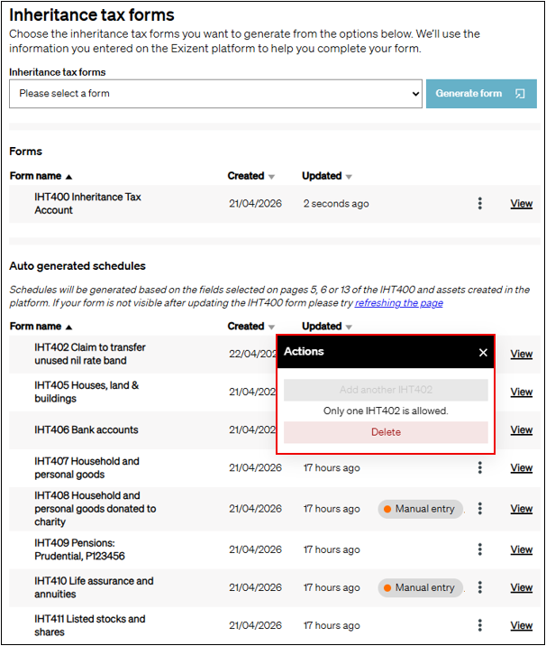 - On the Inheritance tax forms page, auto generated schedules will start appearing on the page as soon as you generate an IHT400 form