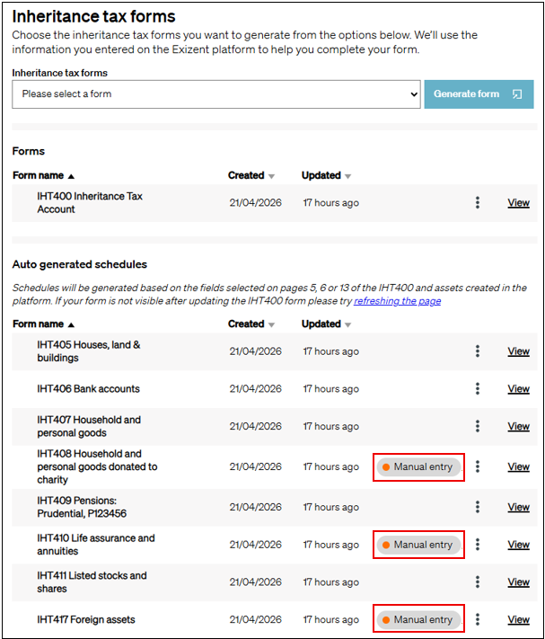 - On the Inheritance tax forms page you will see any auto generated schedules which require values to be manually entered flagged with a Manual entry status